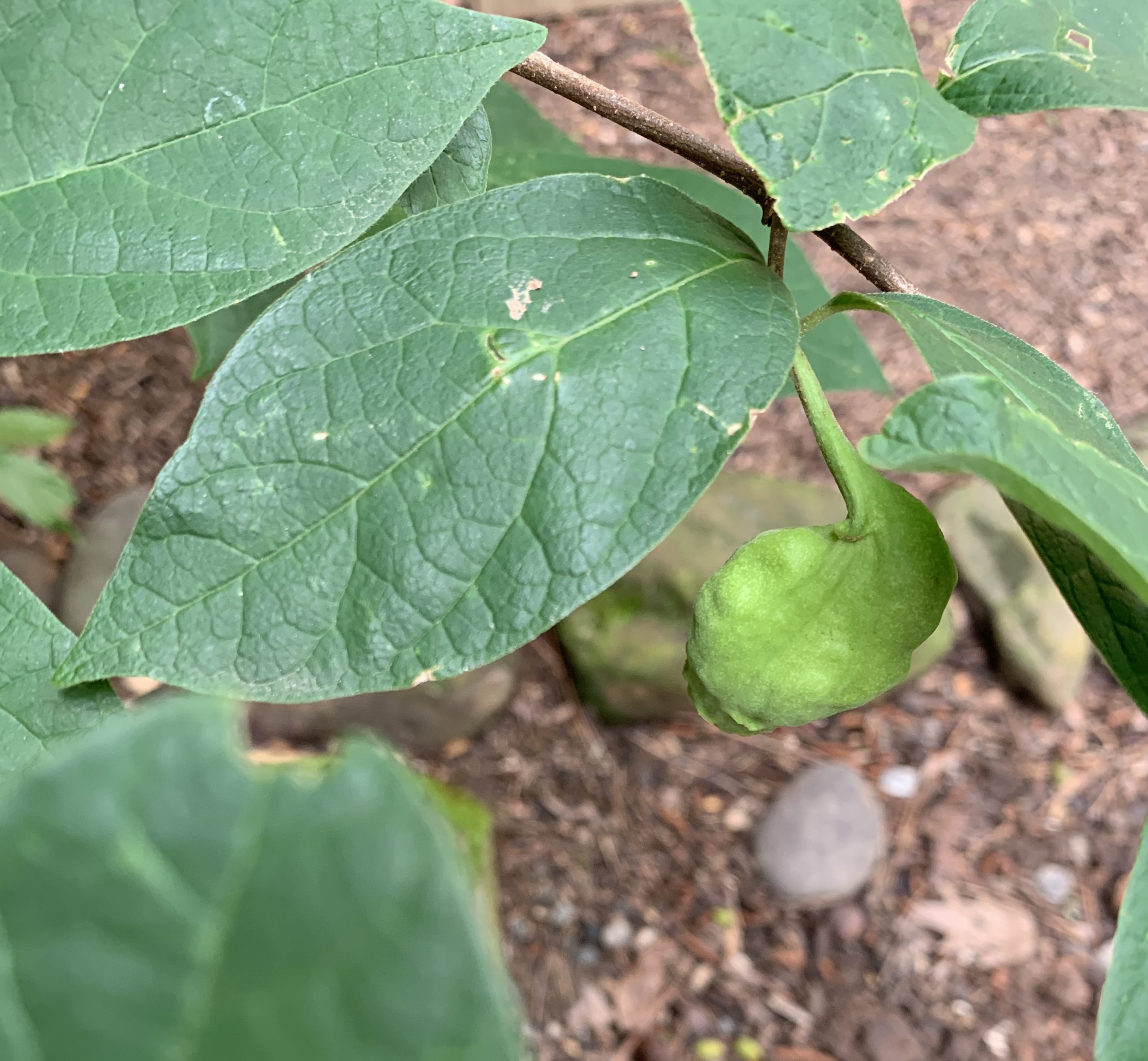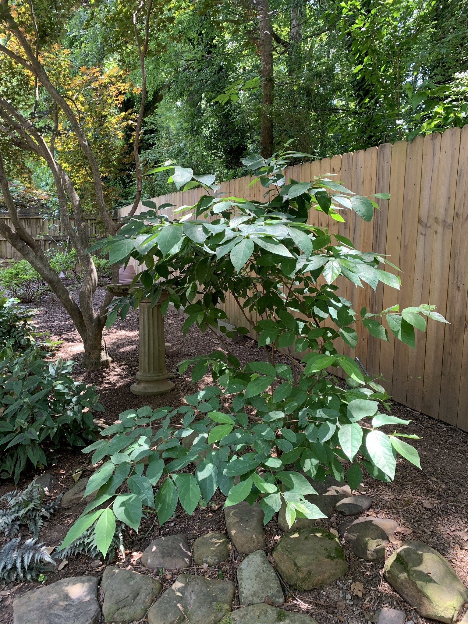 Last September I moved & now have a new garden. This deciduous shrub was here & it measures about 5′ x 5′. It was much smaller last year. It produced calycanthus-like flowers about 1.5″ across in spring. The largest leaf is about 7″ long x 3.5 ” wide. Currently there are 3 drupes of different sizes, the largest about 3″ long.