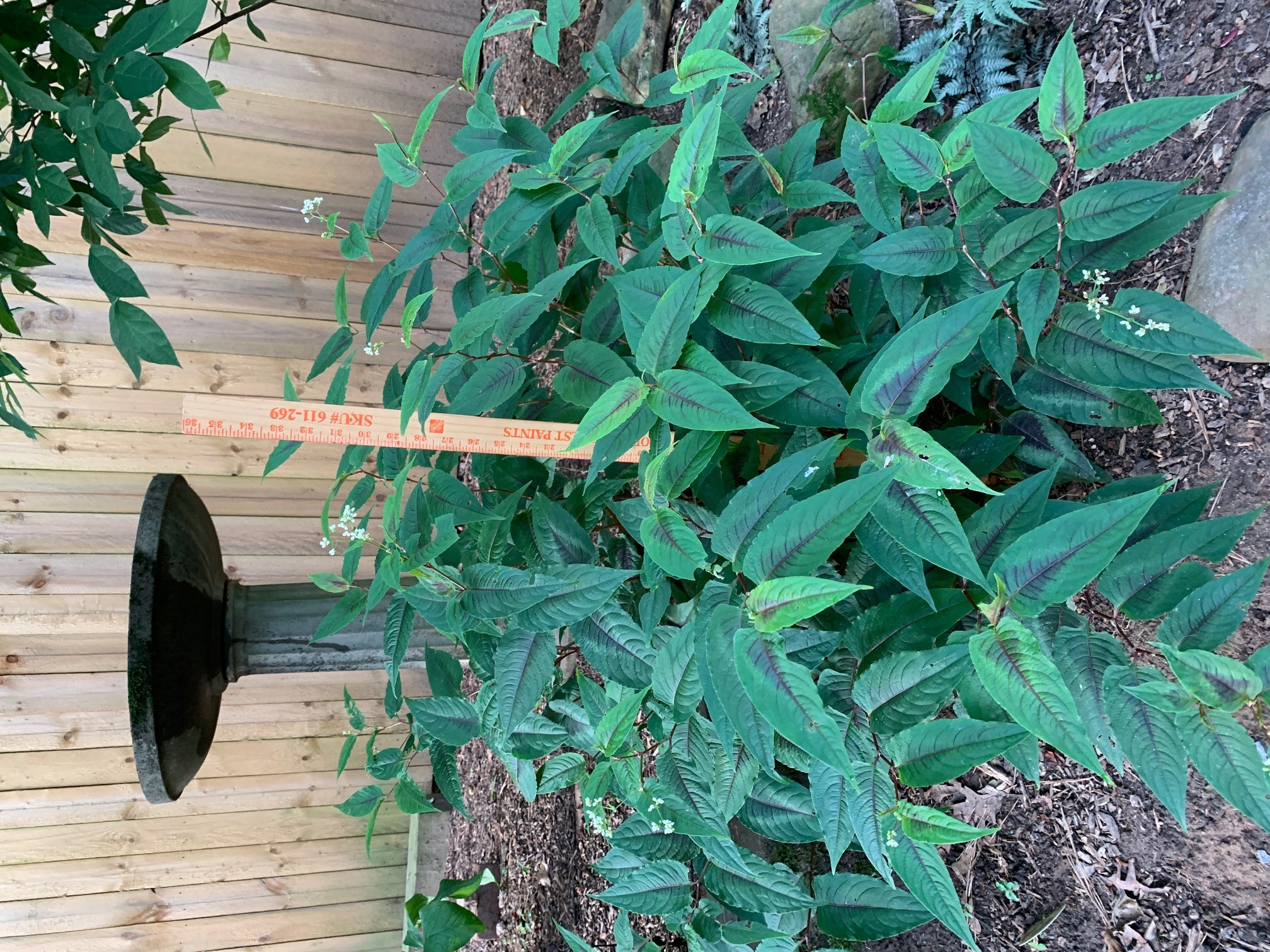 I'm new to this garden but I know this plant was much smaller last year. It is growing in light shade & it's currently about 2 1/2 ft. tall and wide with the largest leaves measuring 7" long and 3" wide.