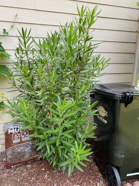 Do you have picture of its flowers? Without flowers, I’m taking a guess here. To my eyes these leaves look like those of oleander (Nerium oleander)? I think you location in plant hardy zone map is 7a- 7b (Marietta, GA?), this is a bit too tender for oleander. According to sources oleander flowers on woody growth of previous year. So drastic pruning will result in no flower in current year. Check out Walter’s web site below for how to grow oleander in GA. Best wishes!
