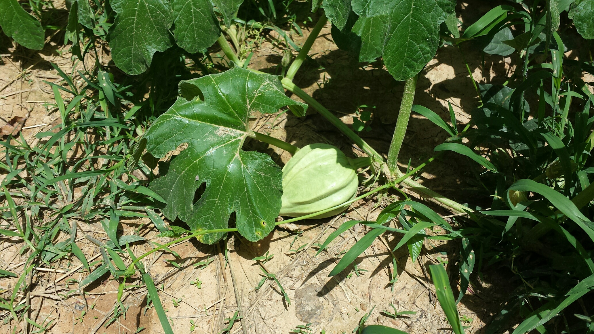 I planted 3 seeds in each hill from a pack or Squash seeds. All seeds looked the same but this came up from one of them. The plant is about 10′ long and this is the only thing onthe vine althought there was other blooms. Since the picture was take the thing has turned dark green. I’m thinking maybe it’s ride now. Any ideas what it is.