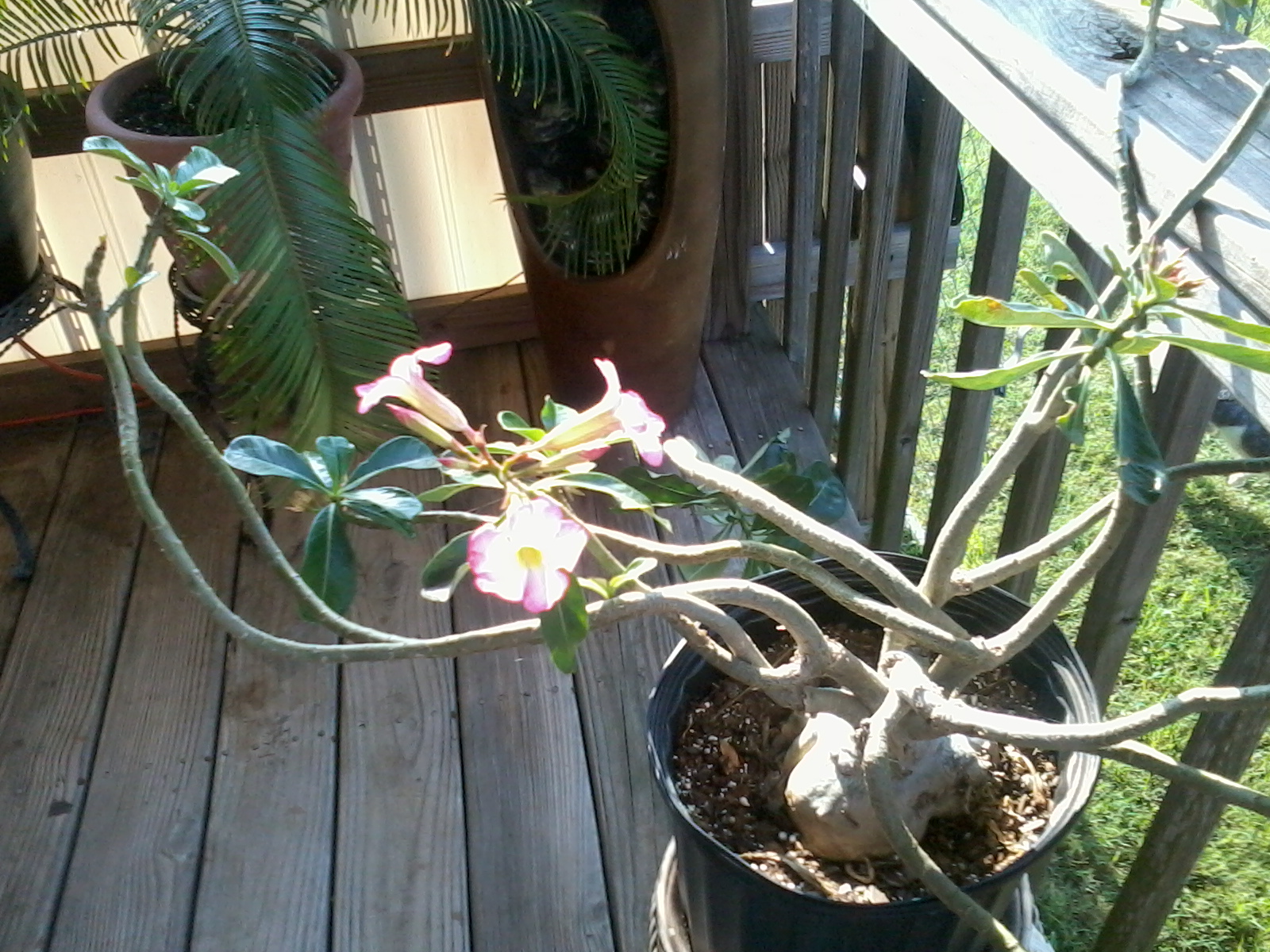 the plant has all these arms and I inhereted the plant when my mom died I had never seen it bloom ever and my mom had it for a long time, when I got it about a month later it started to bloom with pink flowers, ever so often the leaves fall off and new ones return.
