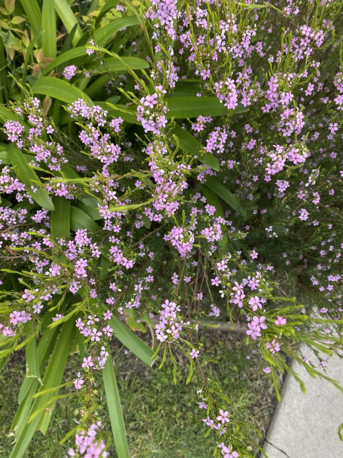 The flowers details are not close enough to tell for certain. I’m guessing maybe a cultivar of breath of heaven/confetti bush (Coleonema pulchellum), possible the ‘Compact Form’? Check it out and see if you have a match. Best wishes! https://www.smgrowers.com/products/plants/plantdisplay.asp?plant_id=420