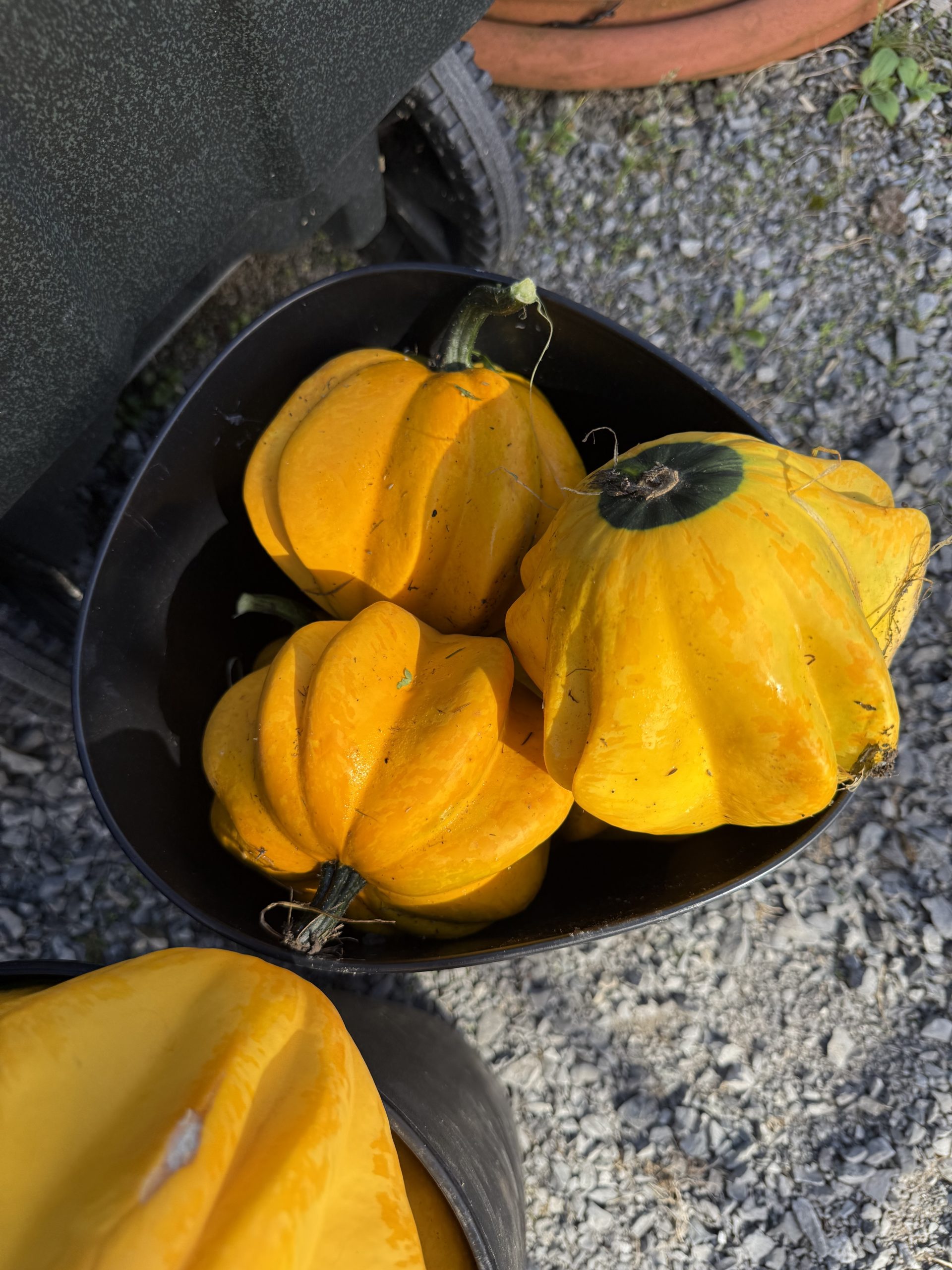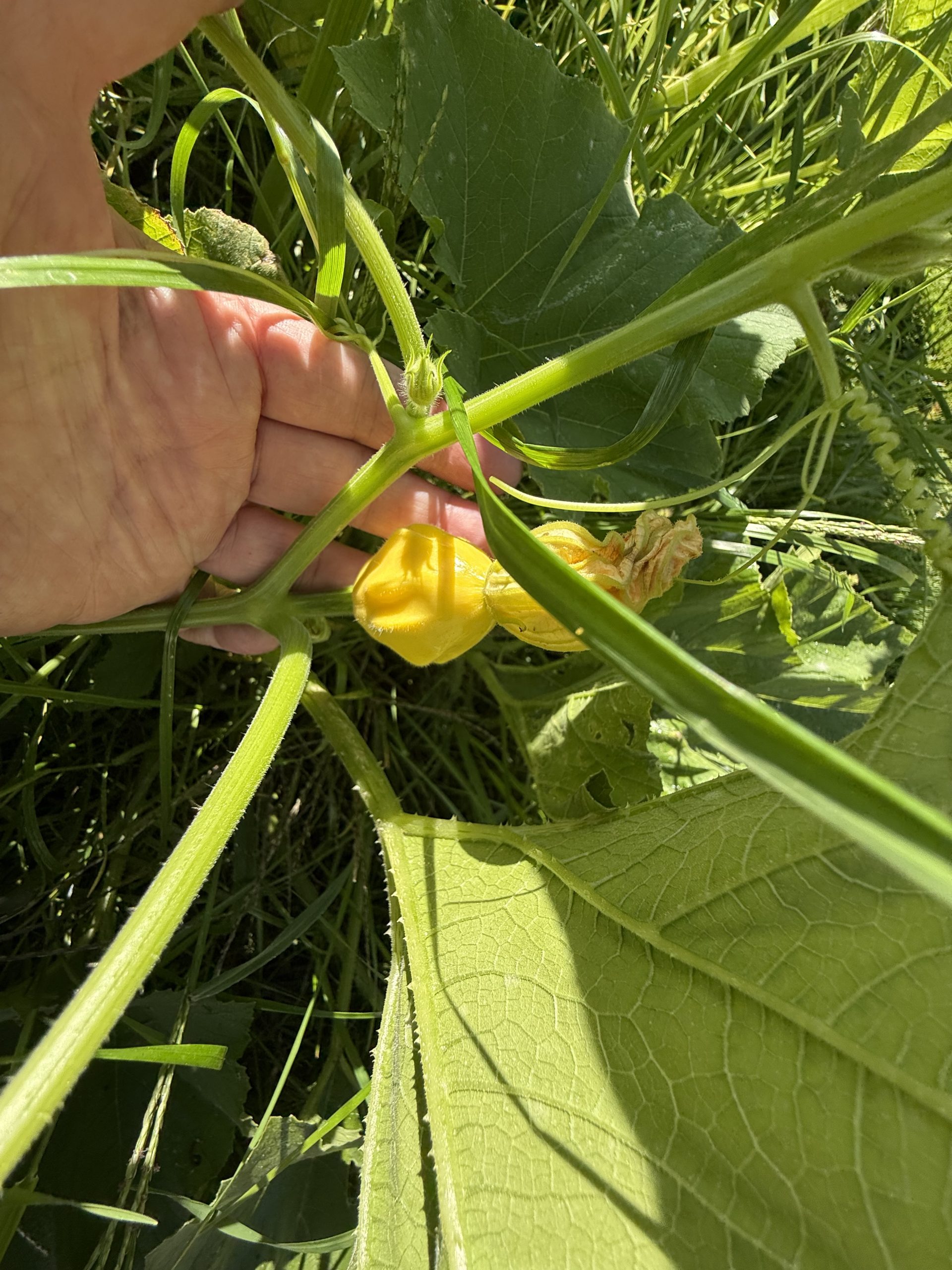 Is this an edible squash? Flowers are yellow with 5 points. The leaves are large with many long vines. The baby plant is starts out yellow with a green spot where the flower is. I also saw one that looked like a round green ball. Mature plants are mostly yellow/ golden yellow with the green spot on the bottom. Mysteriously appeared in a garden bed