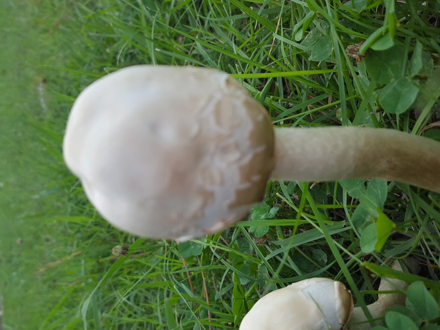Difficult to say unless/until they open up more. Maybe a green-spored parasol (Chlorophyllum molybdites), which is poisonous, maybe a shaggy parasol, which isn’t…could conceivably be something else like a button, but not so common in yards I don’t think. In any case, I wouldn’t recommend eating them to find out…