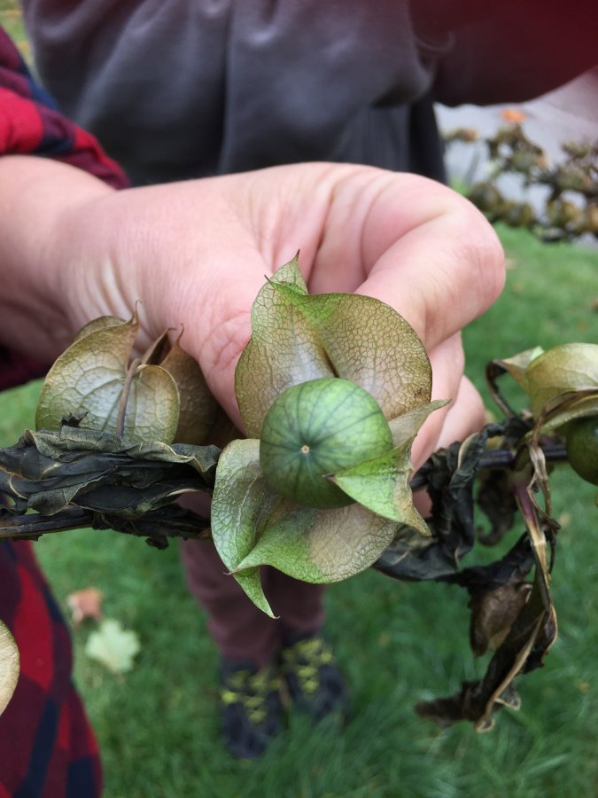 This plant grew VERY quickly over the summer. It has purple flowers that fell off to these (sort of) papery lantern-type buds and inside each is a pod that looks like a teeny watermelon. Inside the “watermelon” and lots of tiny seeds (see attached pics).