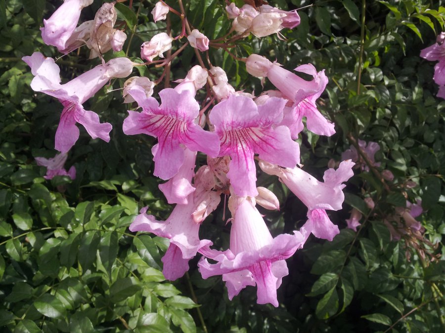 This looks like either Zimbawee creeper (Podranea brycei) or Port St. John Creeper (Podranea ricasoliana). I can’t tell which is yours, but according to the included link the Zimbawee creeper flowers have hair. Check out the genus and see if you have a match. Best wishes! http://pza.sanbi.org/podranea-ricasoliana