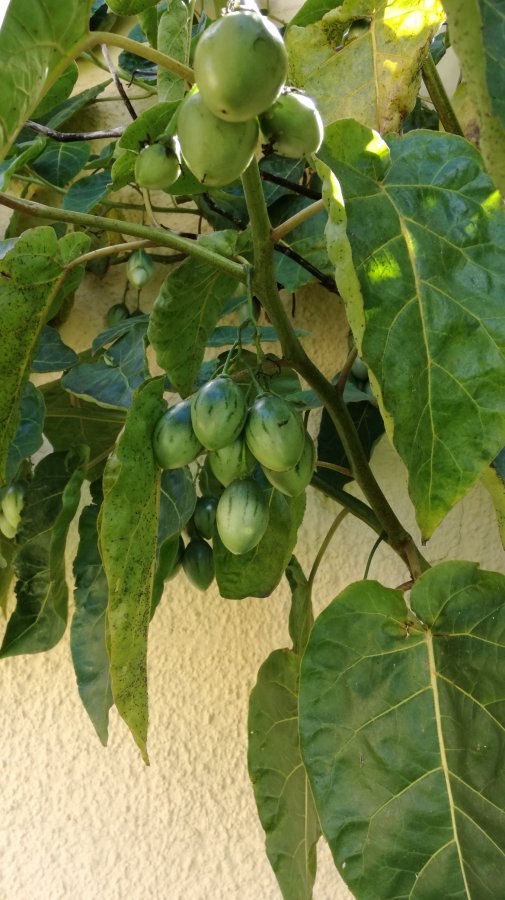 Maybe tree tomato/tamarillo (Solanum betaceum) (?). Check it out and see if you have a match. Click on images to enlarge. Best wishes! https://en.wikipedia.org/wiki/Tamarillo