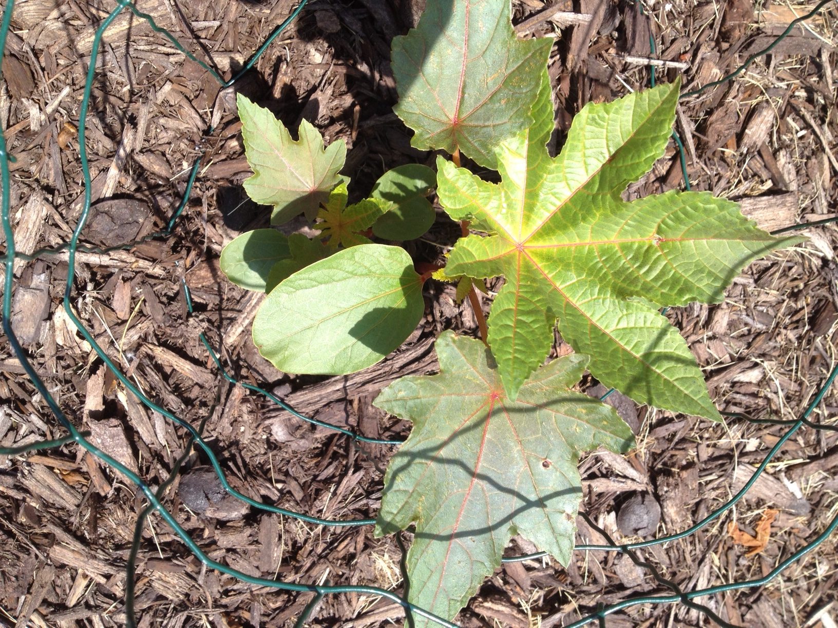 two different leaf types on same plant-lobe and maple leaf like; red stemmed and reddish veins; we believe it is a shrub with reddish flowers; the seed was a pea sized black ball inside a pod/shell similar in material to a peanut shell; it is growing super fast.