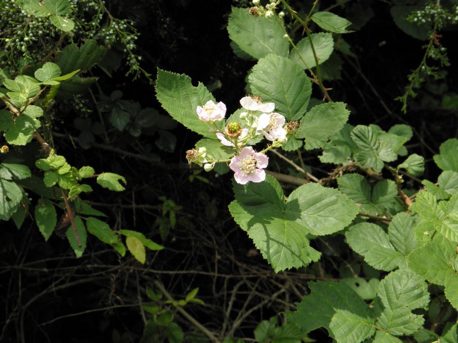 I noticed these blackberries last year. They are HUGE! The blossoms are not white but PINK. They also grow in clusters and the leaves are much larger and more round. They also, apparently, bloom much later than the typical native blackberries as the berries on the natives just a few feet away are already starting to turn ripe and these are still in bloom or any berries are still small and green. Any ideas? I’d like to root some if possible.