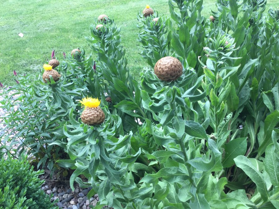 Looks like giant knapweed (Centaurea macrocephal). Check out the link below and see if you have a match. Best wishes! http://davesgarden.com/guides/pf/go/831/