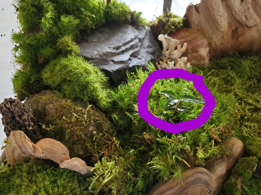 Photo shows detail from a moss terrarium I recently constructed, with the unidentified plant encircled in violet. This tiny plant showed up in the midst of a wild-gathered moss clump, and I hadn’t the heart to remove it! It’s about 1.5″ tall. The leaves are a medium dark green, w/ a noticeably lighter (almost whitish) stripe down the mid-rib and tiny spines all around the perimeter of the leaf edge. It’s cute (at least, I think so), but what the heck IS it? Thanks in advance for your help!