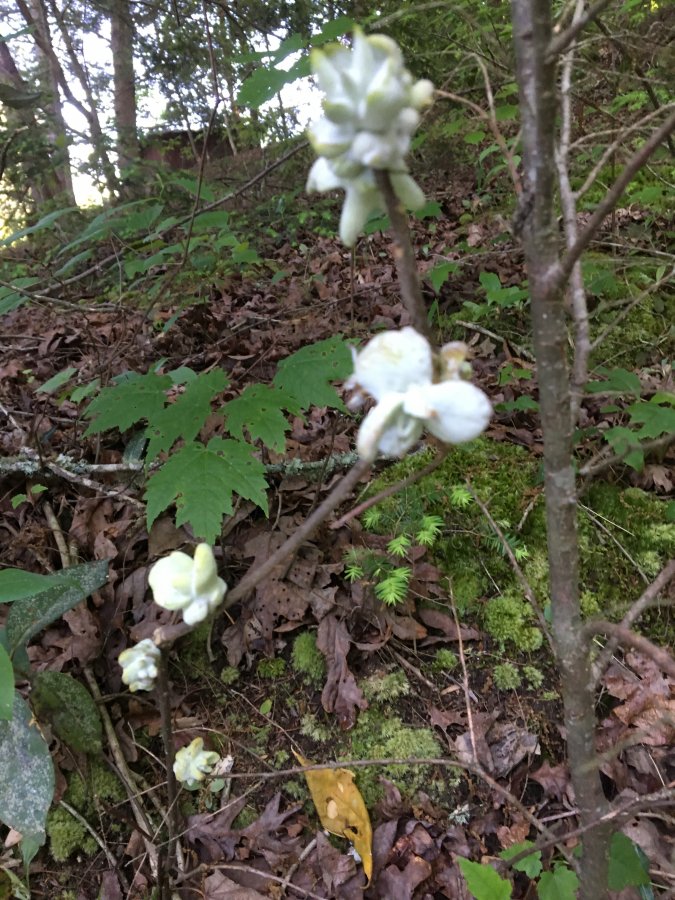 White ÒbloomsÓ like rubbery. No leaves on stem with multiple blooms. Separate stem with 1 boom has one leaf.