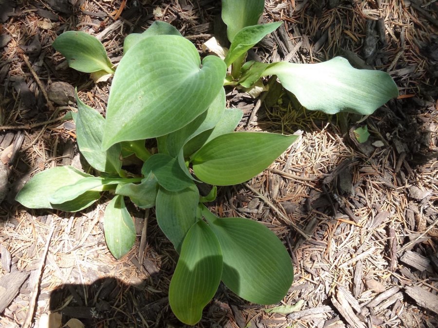 The plants on the upper right and lower left showed up in my garden in May. The leaves are thick, stiff, bluish/green, a bit wavy and low to the ground. The taller plant, which looks like a hosta to me, had thinner leaves and a bit greener caste. It just came up over the past few weeks. We’ve had dry weather and I finally gave my garden a good soak – and the new one showed up. I don’t recall planting anything in the area that this has come up in. I have hostas planted around these plants.