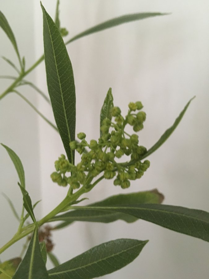 The flowers/buds details are not too clear to tell. I could only speculating that this could be a greenformhop-bush cultivar of the Dodonaea genus, maybe the Florida hopbush (Dodonaea viscosa) with a male flowering plant? According to sources, male & female flowers bloom on separate plants, although sometimes they bloom on the same plant. Check out it out if you have a match. Best wishes! https://www.google.com/search?biw=1920&bih=909&tbm=isch&q=dodonaea+viscosa+leaves&sa=X&ved=0ahUKEwiFpeDKid7RAhUIWSYKHXuTCPIQhyYIJA&dpr=1#imgrc=F7jdYCekFav51M%3A