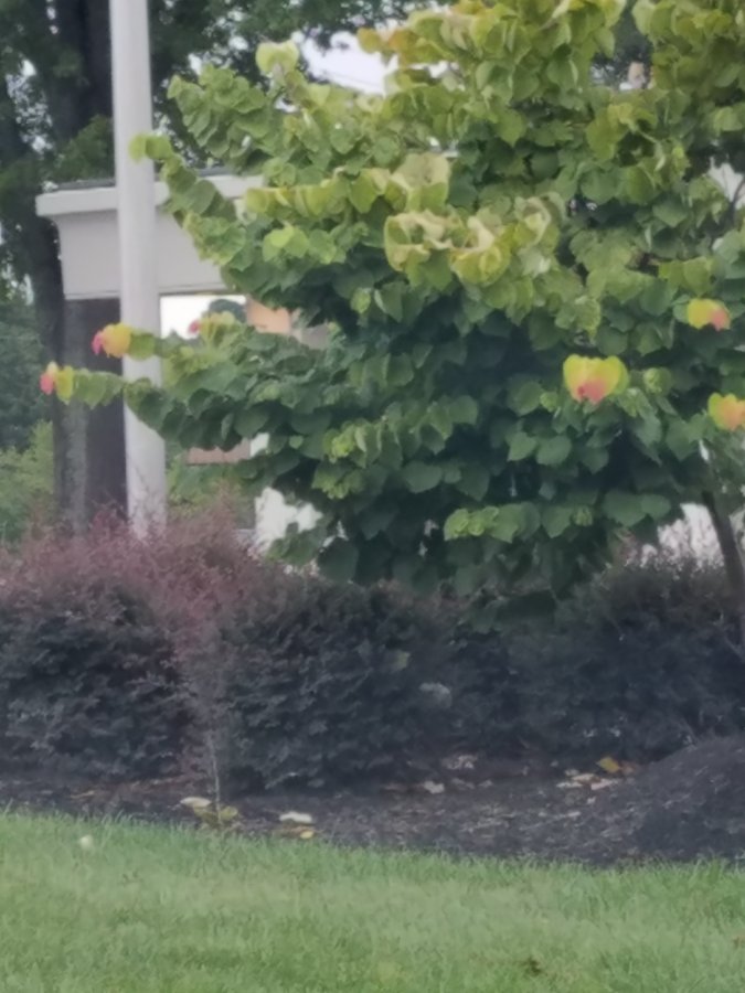 Pictures taken from car at stoplight. I’ve only seen this shrub once before. The leaves turn different colors up the branch ending in a heart shape (from what I’ve been able to tell from the car)