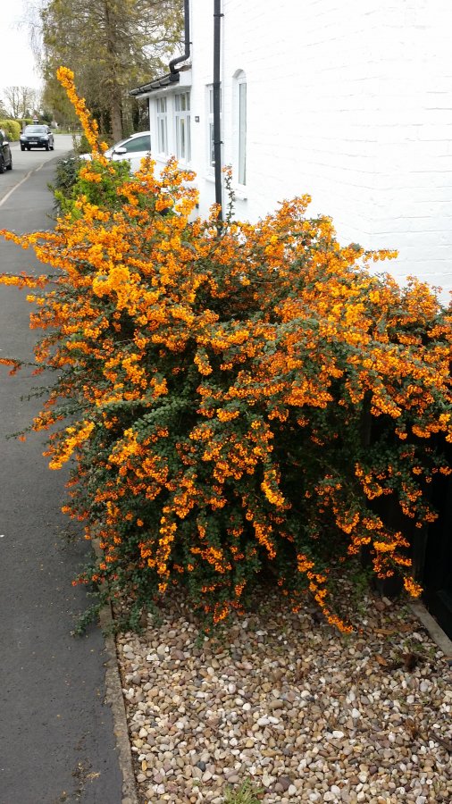 Shrub’s leaves & flowers details are too far away. I’m speculating this might be a cultivar in the barberry (Berberis) probably the B. darwinii? plant. Check out the Berberis darwinii ‘Compacta’ (Compact Darwins Barberry) and see if you have a match. According to sources, barberry does grow in the U.S. but different species grow in different regions. Link below for information & vendor on B. darwinii (not the ‘Compacta’ cultivar,) Best wishes! http://davesgarden.com/guides/pf/go/1657/