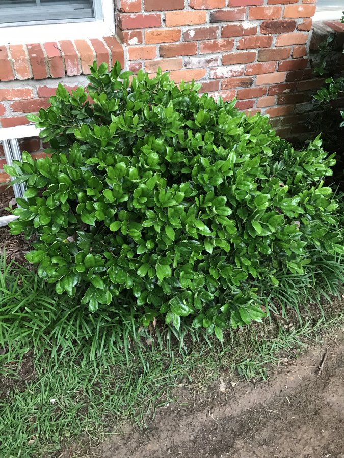 About 3 feet in diameter. Waxy leaves. Does not flower. No red berries like Holly.
