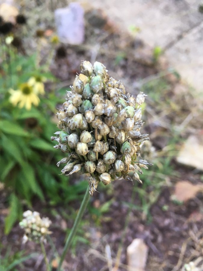 This picture shows the top of a plant, I assume a flower, that has maybe gone to seed? They are tall (2+ft), individual stems with no leaves I can see. They looked like this when we moved in, so I have not seen them in any other seasons.