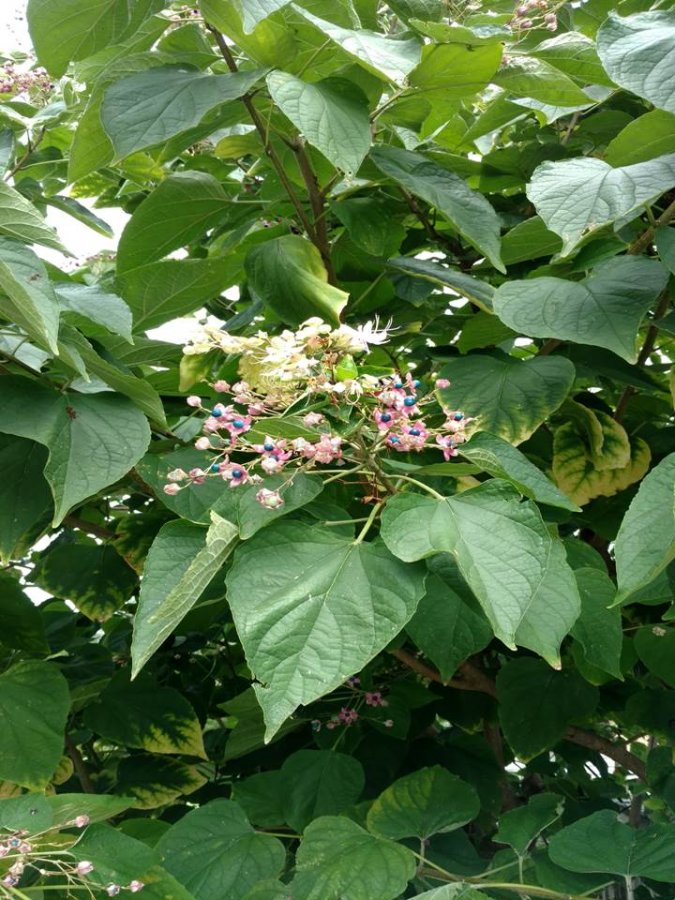 Heart shaped leaves, 5 stared flowers, blue berries in the buds