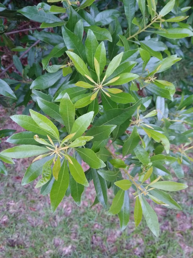 Can you show us a closeup of the main trunk and side view of the plant. For now I’m guessing maybe a type of wax myrtle (Morella)? Possible the M. cerifera? Check it out and see if you have a match. Again, I’m only speculating. Best wishes! https://adkins.donorshops.com/product/Morella-cerifera/morella-cerifera-wax-myrtle