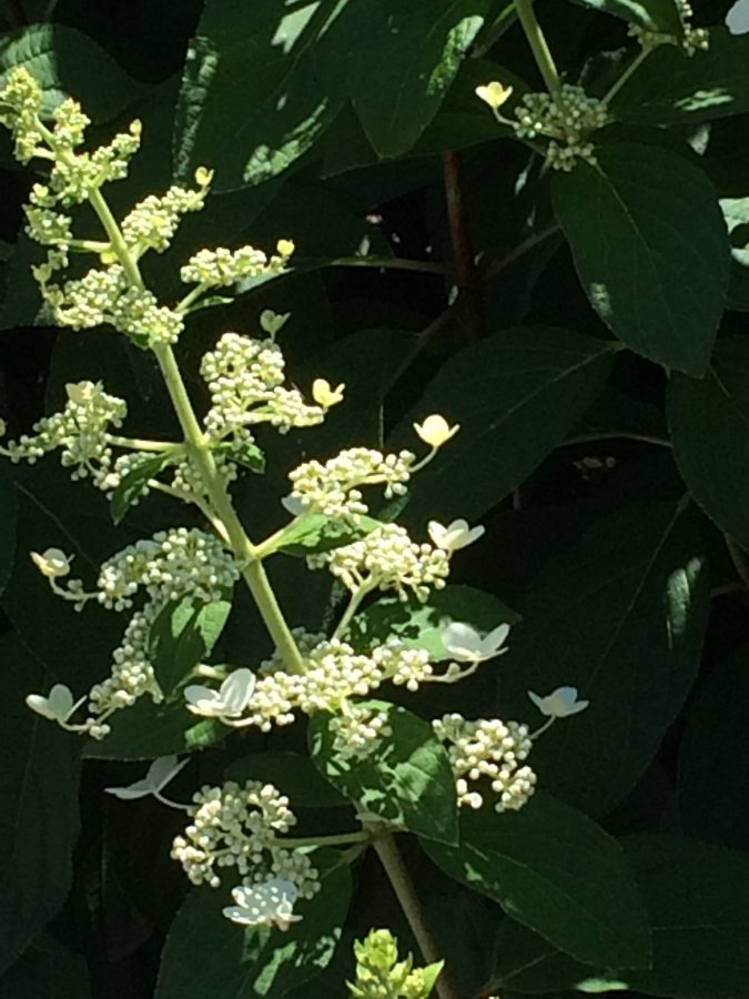 This shrub was in a well maintained business landscape, planted in full sun. The blooms are over a 12-13″ length. It looks like the bloom on an oak leaf hydrangea, but the leaf is different.