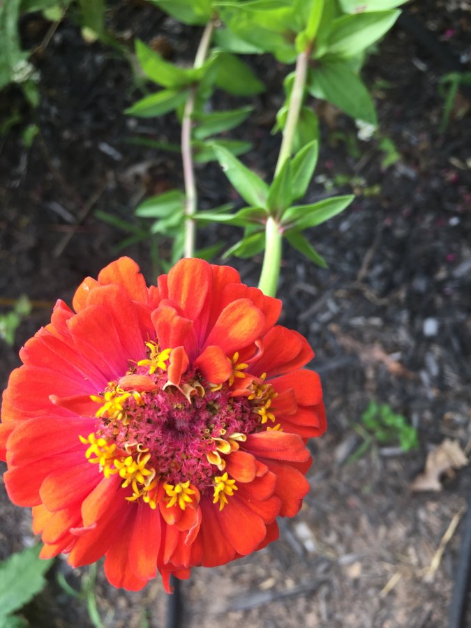 I got zinnia seeds 4 yrs ago & have been planting/harvesting each year from those same seeds for a lovely mix of colors & shapes. This plant volunteered this year. It had darker, thickly set, doubled leaves from the start. The flower is much larger than any of the others, and the centers seem doubled. The leaves grouped in 4-5 point stars, or 2-3 on one side, instead of the usual opposite pairs. The pix are two blooms on the same plant. Do I have a ‘sport/throwback’ here? New variety perhaps?