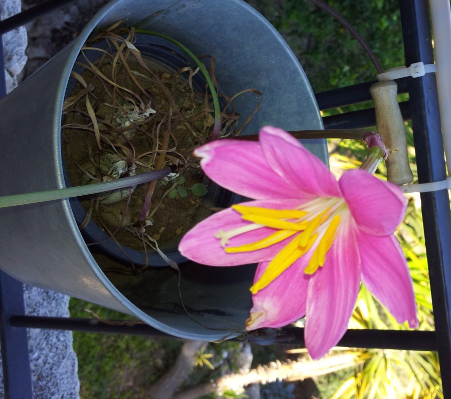 This flower has a bulb and very narrow leaves. The flower opens in the morning and wilts the next day. The old neighbor who gave it to me said it does better restricted in a pot than if planted in the ground.