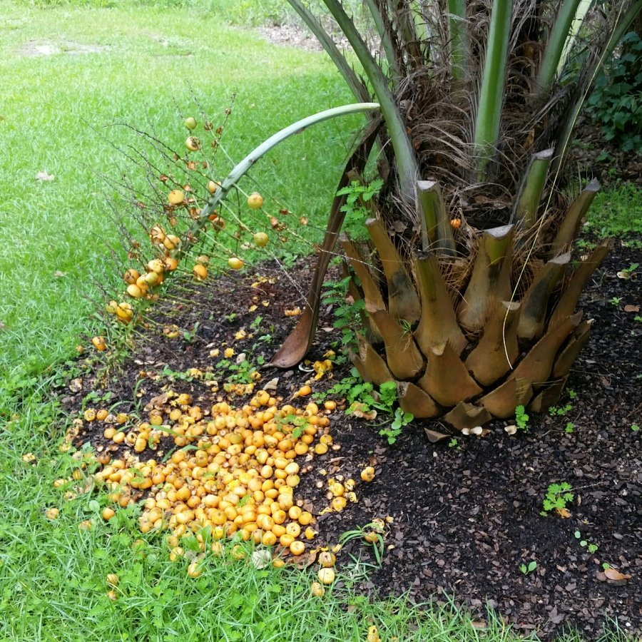 I wish I could the palm’s fronds to be certain. For now just a guess, check out he jelly palm image from the link below. Click on it twice to enlarge. If it isn’t jelly palm, make new post with photo of its fronds. Best wishes! https://commons.wikimedia.org/wiki/File:Butia_capitata_palm_bearing_both_ripe_and_unripe_fruit.jpg