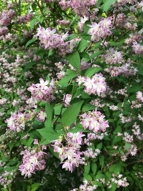Maybe a cultivar in the Deutzia genus? Check out on the in the group the ‘Strawberry Fields. Click on images to enlarge. Best wishes! https://redsearch.org/images/p/deutzia_strawberry_fields