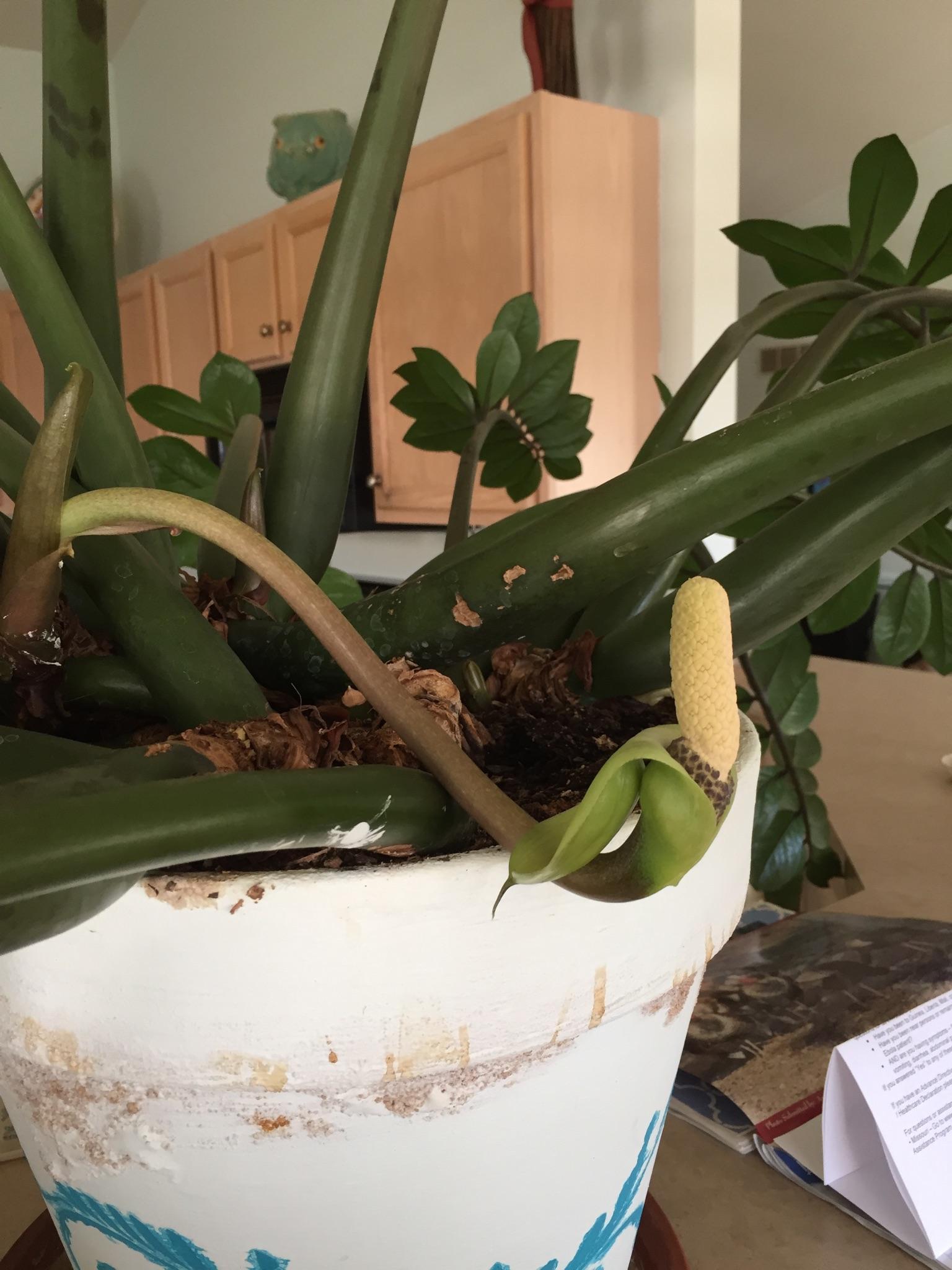 It was purchased as a bonsai 12 years ago, but it now has 4 foot stems and a flower!