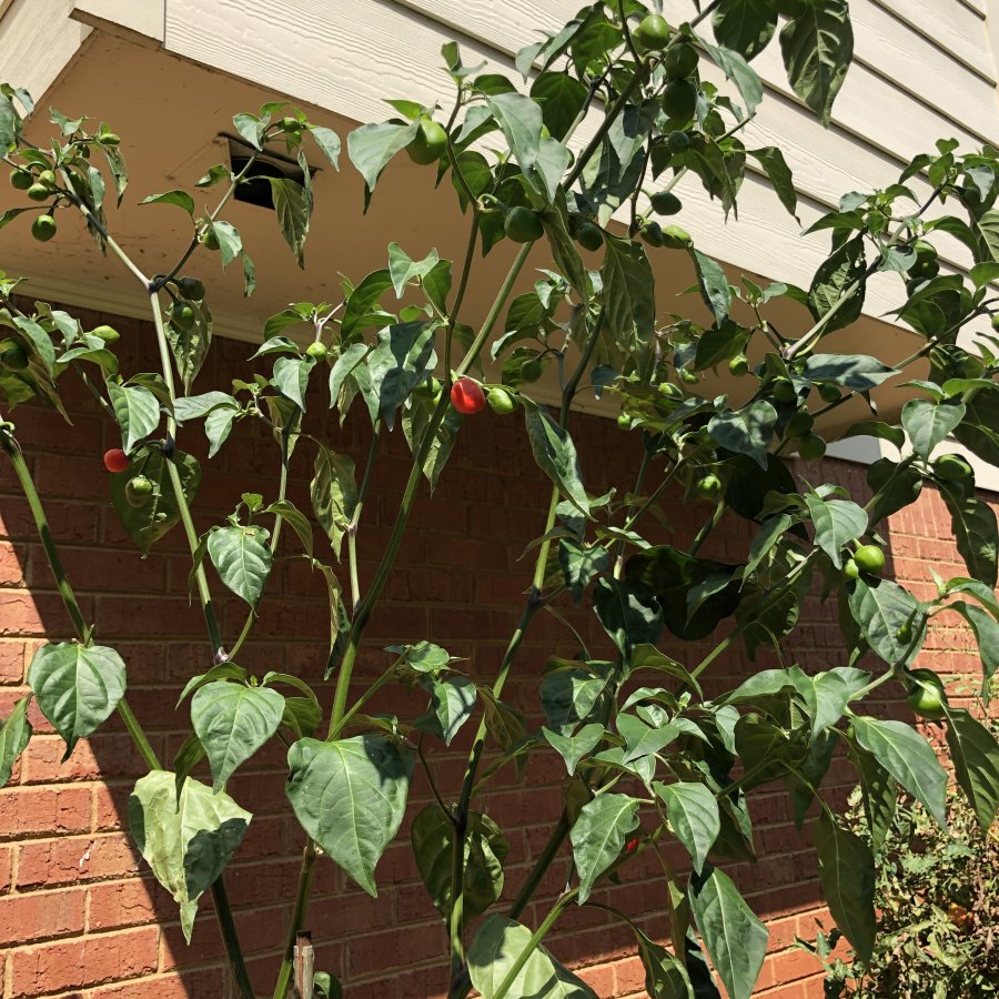 This is the second year this plant has come up volunteer. It is in a spot where I planted jalape–os and sweet peppers the year before, but none like this, it is nearly six feet tall and has a single stalk coming out of the ground and bushes out about half way up. The peppers are about a half inch in diameter, I tried biting into one of these peppers last year and it was very much hotter than the jalape–os.