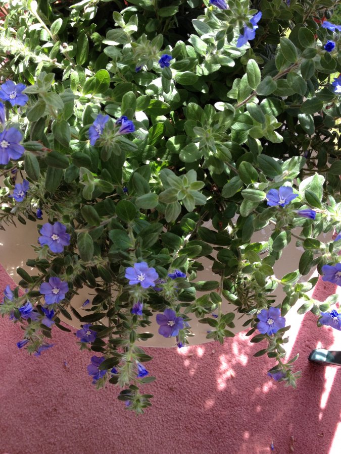 Periwinkle , 5 petal blossoms with white centers. White/silver fuzz. Requires a lot of water.