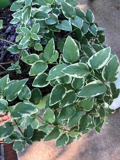 Here is a potted periwinkle. Puts out sweet little purple flowers in the spring. Provides lots of viny verigated leaves throughout the year. Great add to any potted plant on porches or decks. Very low maintenance.