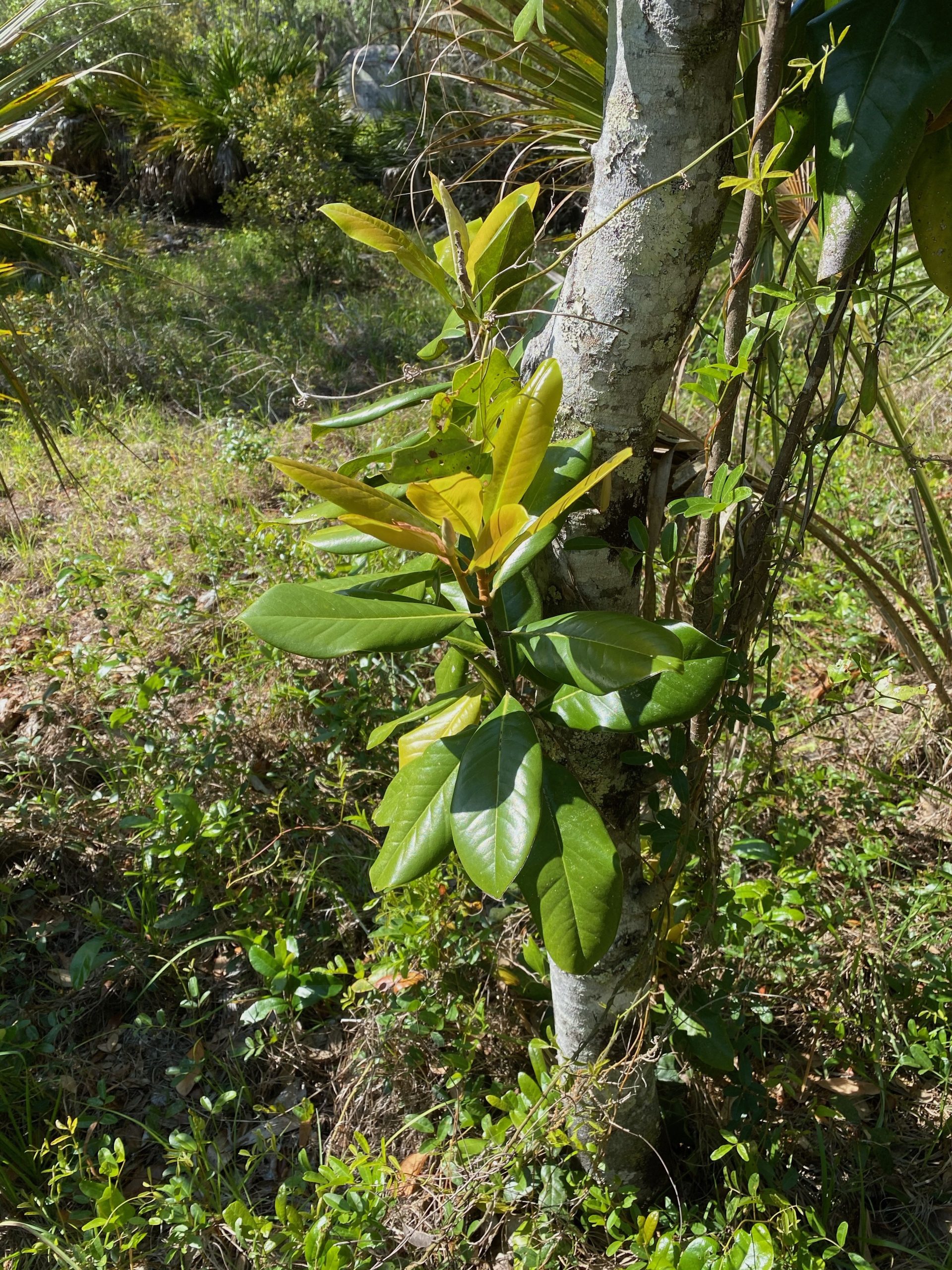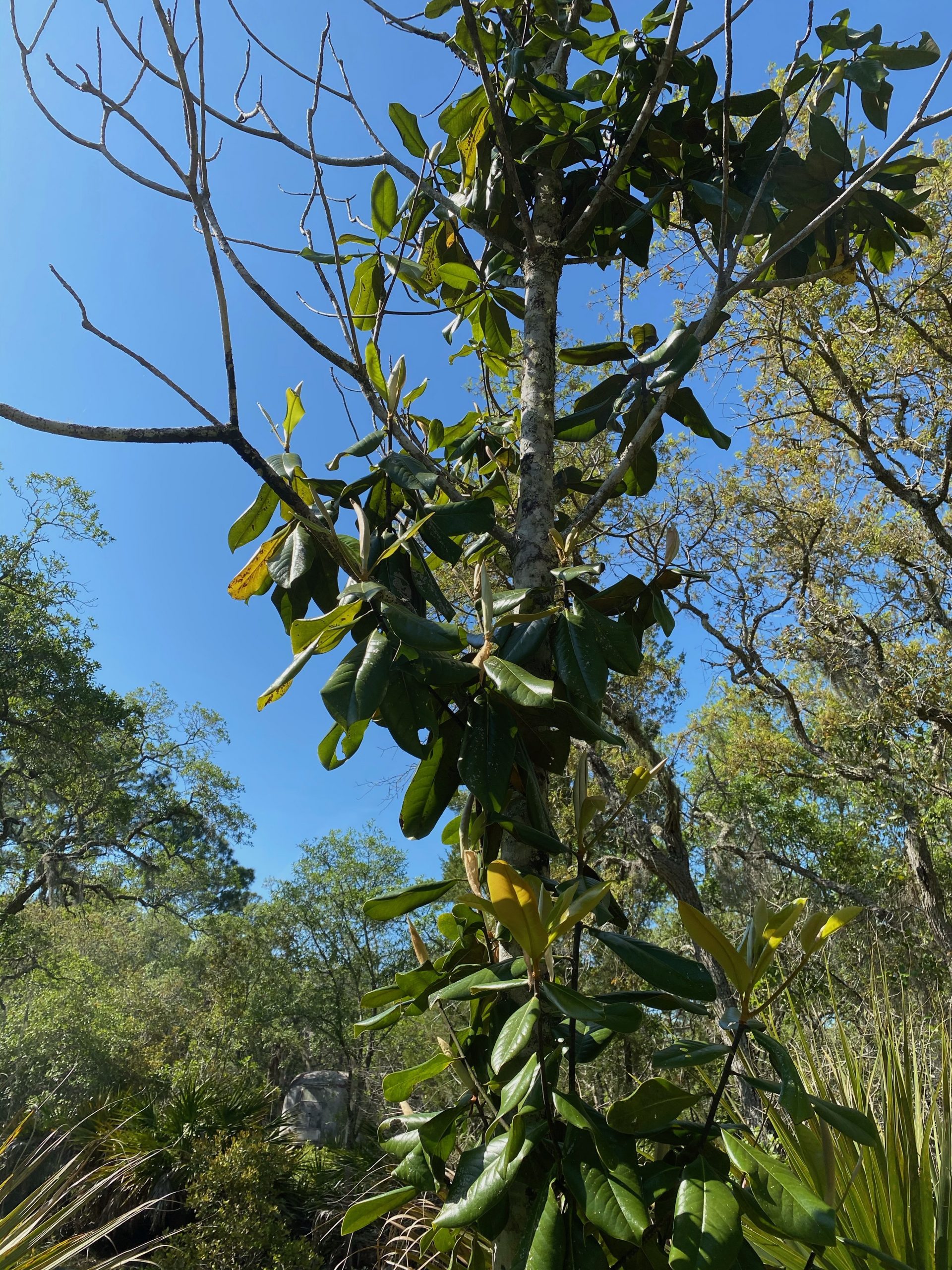 Any ideas what ails this magnolia? I don’t know the history of it (on my new property), but it has bare branches with leaves (and healthy blooms) only near the trunk. Leaves look ok, no pests/mildew. Habitat is coastal hammock, 1 mile from the gulf. Soil is sandy w/ organic matter mixed in due to oak trees and other plants. Elevation 6ft > sea .