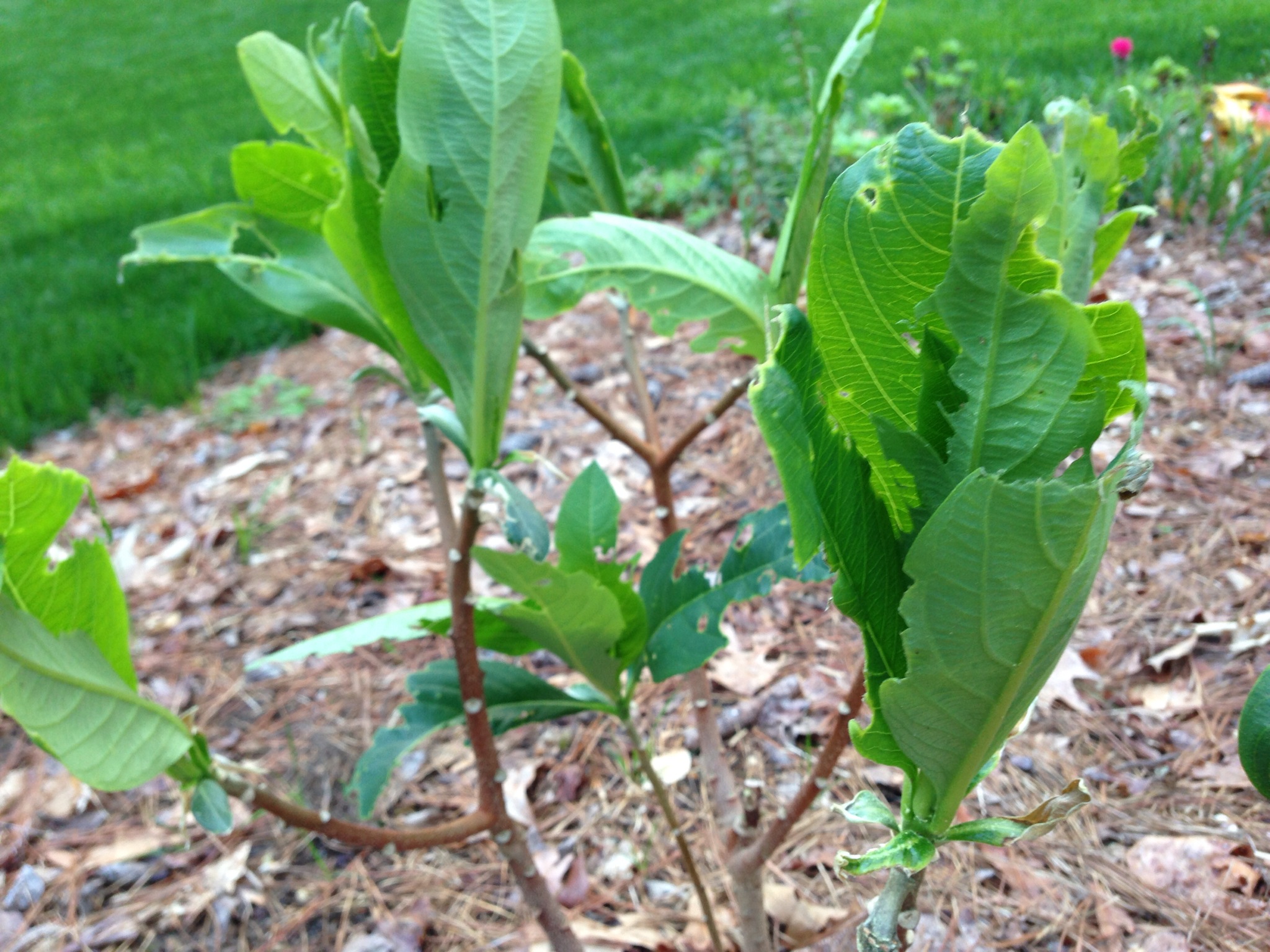 I planted this edgeworthia chrysantha last fall when it still had leaves. Now that the leaves are starting to grow, I noticed something is eating the leaves. What might it be and what is the best way to treat it? Thanks. Mark