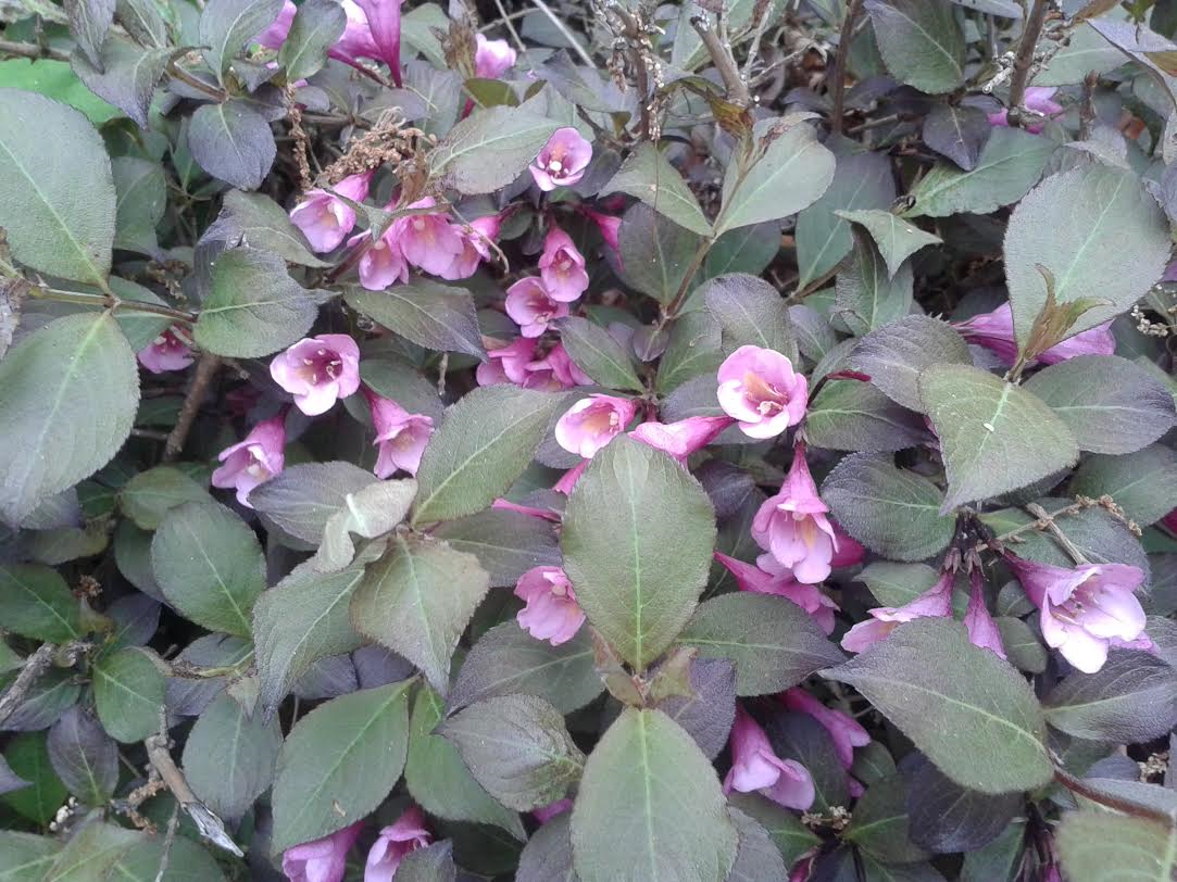 Maybe a Weigela florida cultivar with a darker foliage. Sorry, I do not know which one this is> Best wishes! https://www.google.com/search?q=Weigela+florida+with+dark+leaves&sa=X&biw=2085&bih=1015&tbm=isch&tbo=u&source=univ&ved=0ahUKEwi58pib84TNAhUKKlIKHfiyDBwQ7AkIKg&dpr=0.9#imgrc=_