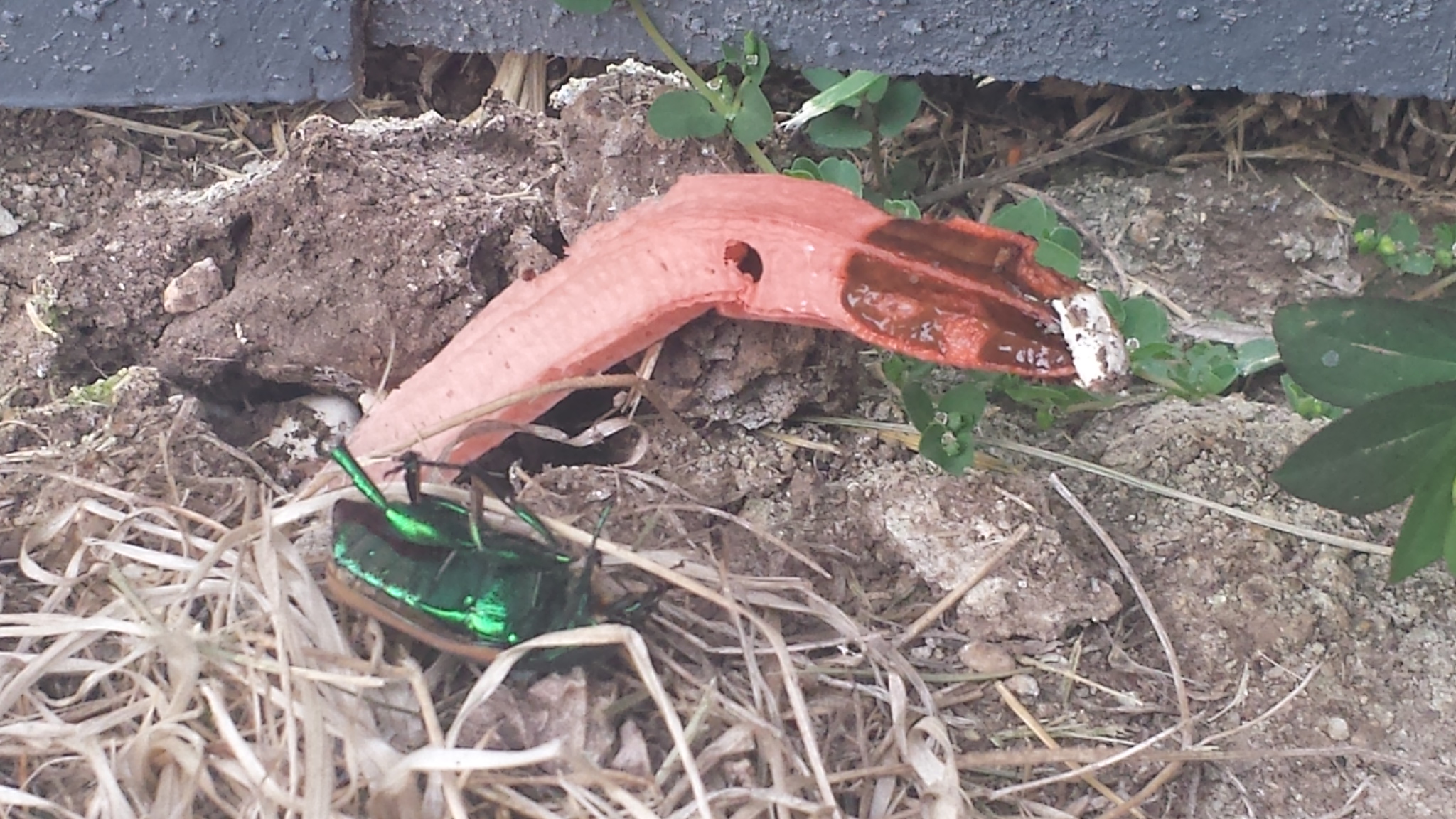 This specimen was spotted one afternoon along a backyard fence. Within just a few hours of spotting it, it was already drying up and dying. I put a beetle next to it for size reference.