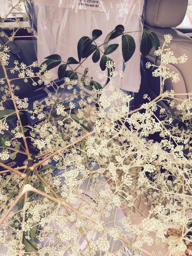 My guess would be Aralia spinosa. Very attractive flowers… attracts butterflies… Bit of a colonizer in the garden, though.