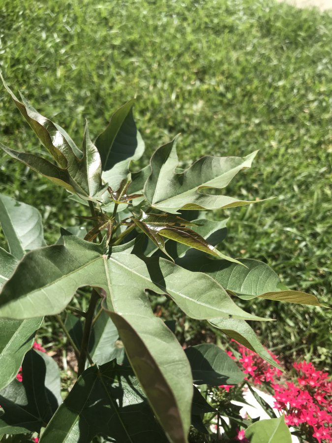 the back of a leaf & its coloring from another variety in the Jatropha genus. https://commons.wikimedia.org/wiki/File:J._curcas_x_integerrima_-_leaf_pigmentation_(4737339395).jpg