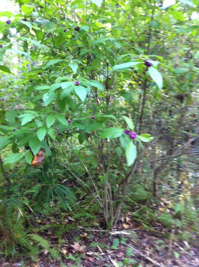 Plant about 5 foot tall with purple fruit found in deep shade beside a creek in the woods behind Loganville, Ga. home.