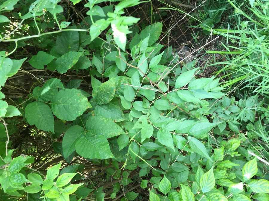 At 56, I got poison ivy. First photo is where I was cutting weeds back. 2nd photo grows/consumes next to my fence. 3rd photo, small holes near my back patio. Counted 12. I have lived in the house for 8 yrs. cutting back same weeds every yr just outside of my back fence to keep them out of my yard. I have many diff plants I would like to ident but will start here. I think the holes are wasp holes. Some have mounds of sand around them. Granddaughter said japanese hornets, they do look similar