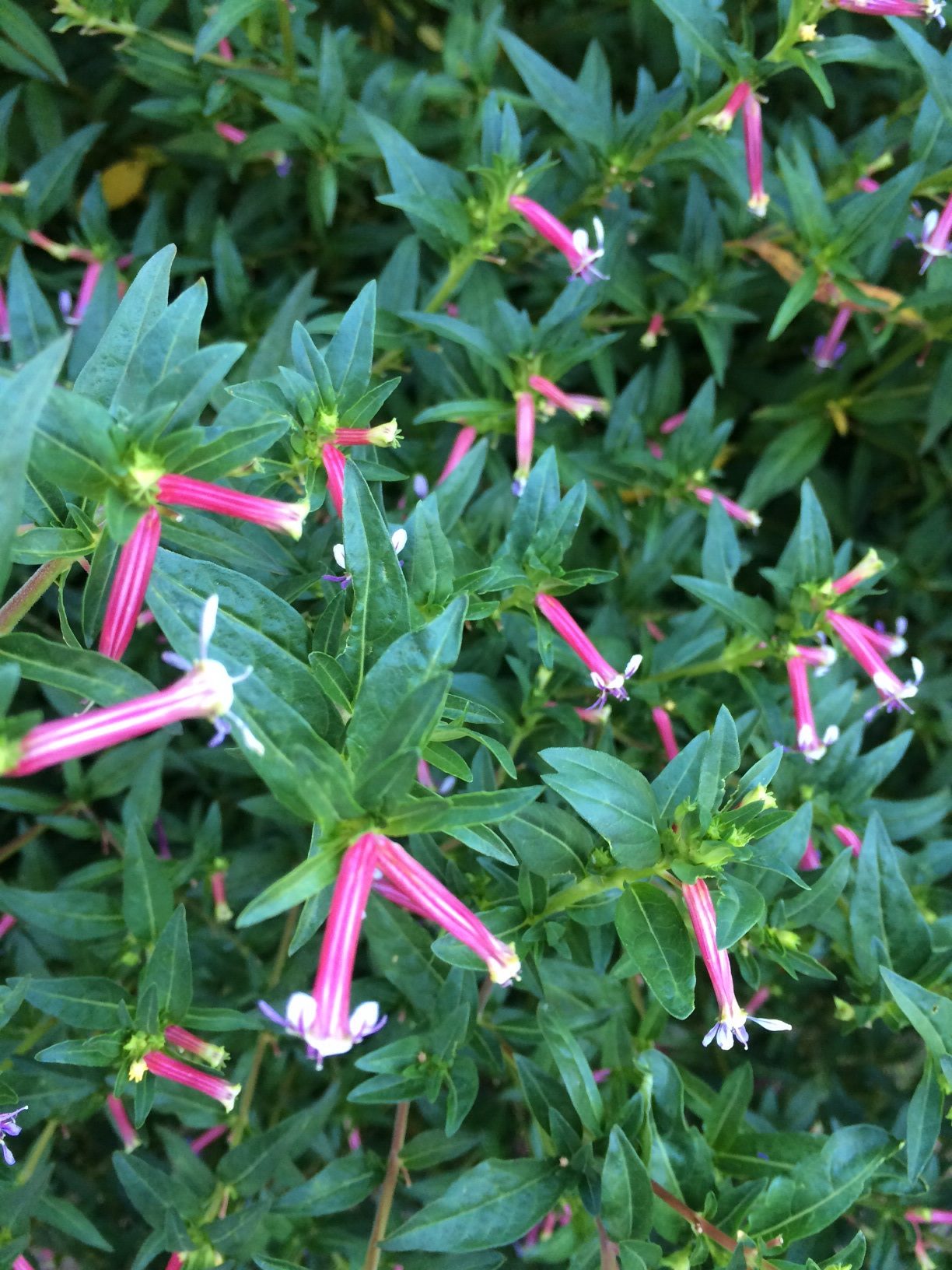 Looks like cigar plant (Cuphea). Sorry, I can’t tell which hybrid or species this is. Some hybrids include ‘Twinkle Pink’, ‘Starfire Pink’, and Kristin’s Delight’.