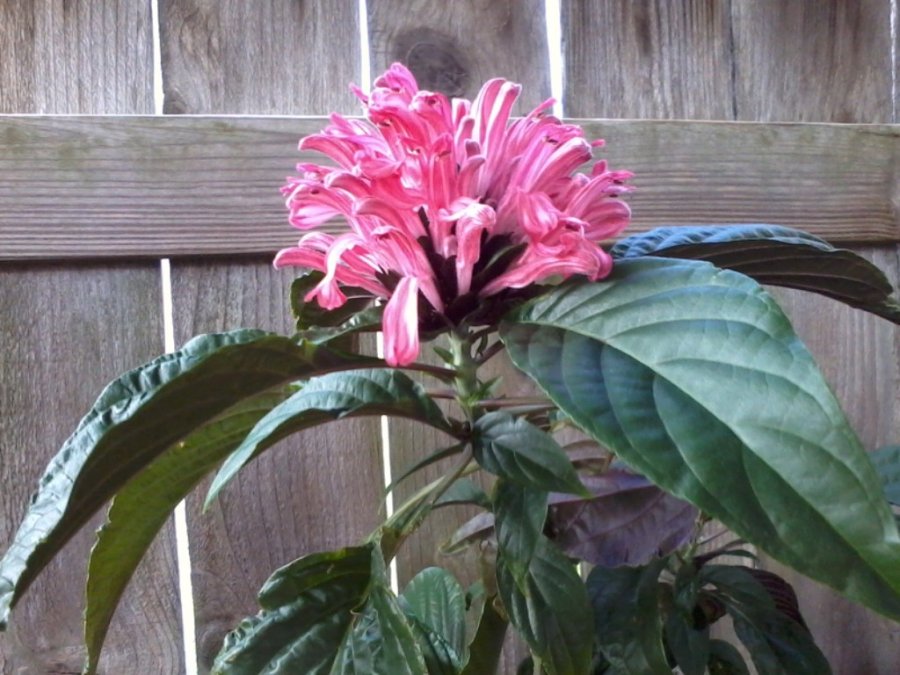The flower is pink and somewhat unique. The leaves are a deep green.
