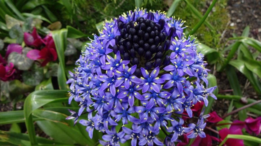Looks like a cultivar in the Protuguese squill (Scilla peruviana). Check out the included link below for a cultivar named: ‘Caribbean Jewels’. Best wishes! https://www.monrovia.com/plant-catalog/plants/4905/caribbean-jewels-peruvian-scilla/