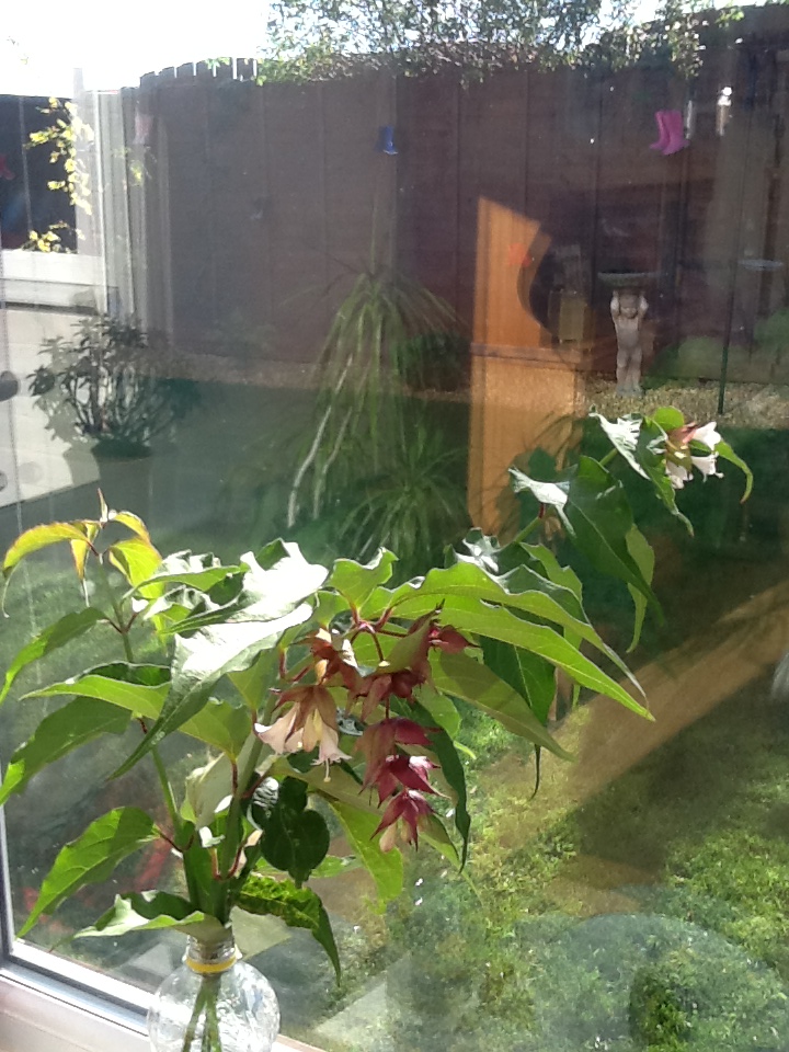 Maybe Himalayan honeysuckle (Leycesteria formosa). https://en.wikipedia.org/wiki/Leycesteria_formosa