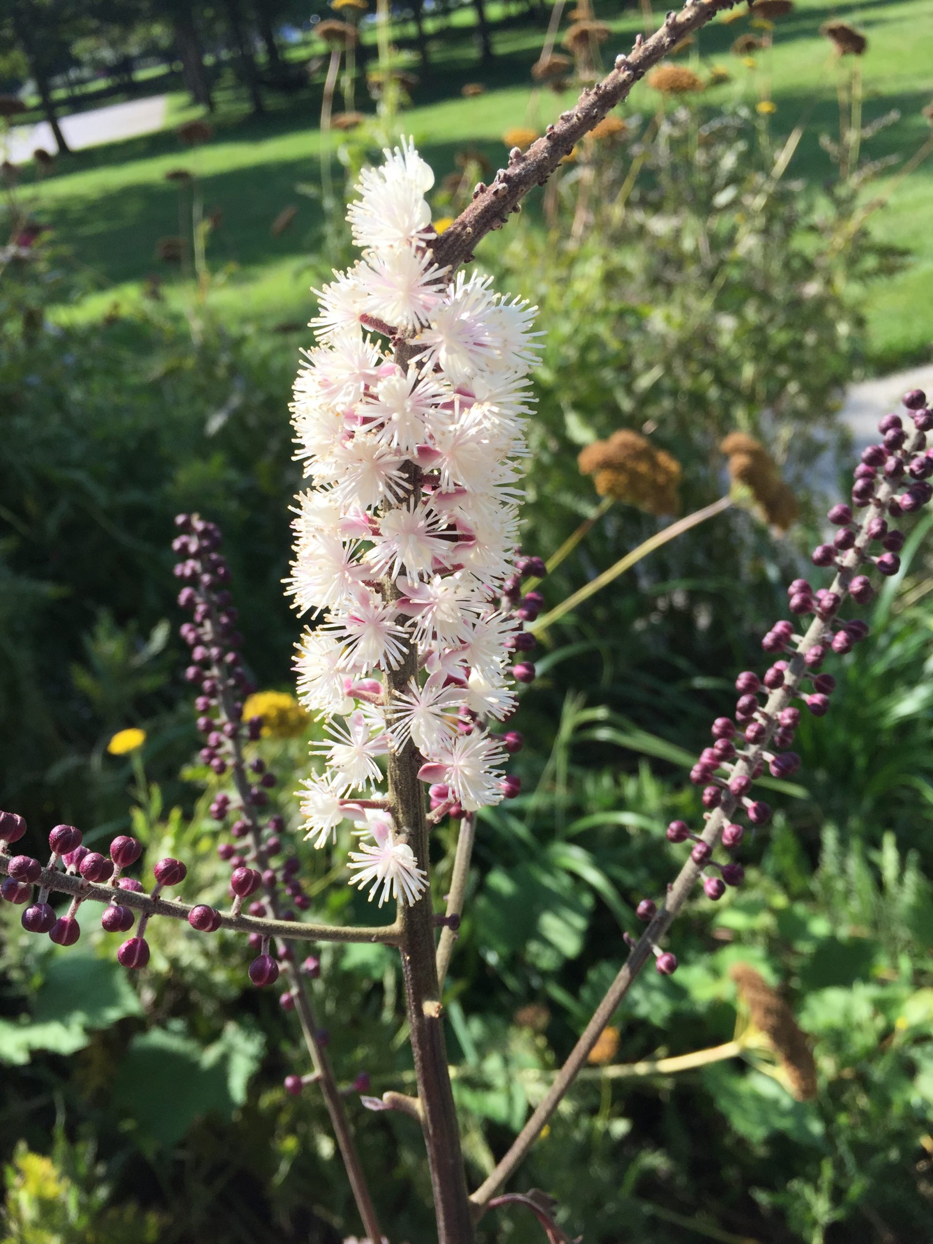 Maybe a cultivar of black bugbane aka black cohosh (Actaea racemosa syn. Cimicifuga racemosa) or Acteae simplex. Some of the purple leaves cultivars in the A. racemosa group: ÔAtropurpureaÕ, and ÔBrunetteÕ. In the A. simplex group : ÔHillside Black BeautyÕ, ÔBlack NegligŽeÕ.