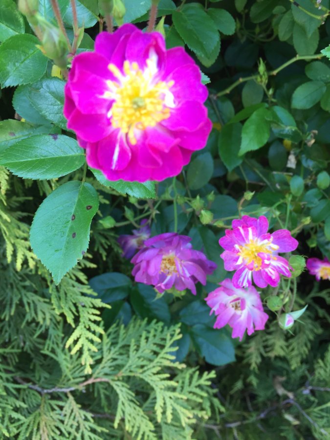 Maybe the hybrid mutiflora Blue Rambler/Blue Rosalie (Rosa ‘Veilchenblau’). Link below with more information. Best wishes! https://en.wikipedia.org/wiki/Rosa_%27Veilchenblau%27