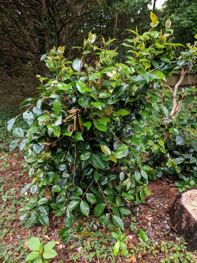 Hello All, We just bought our new home. With it comes a few trees and shrubs needing identification. There are six of these shrubs. Hand size red flowers in spring. Unfortunately, we closed on the house after flowering – no images. Smooth dark green leaves. Thanks for your expertise!
