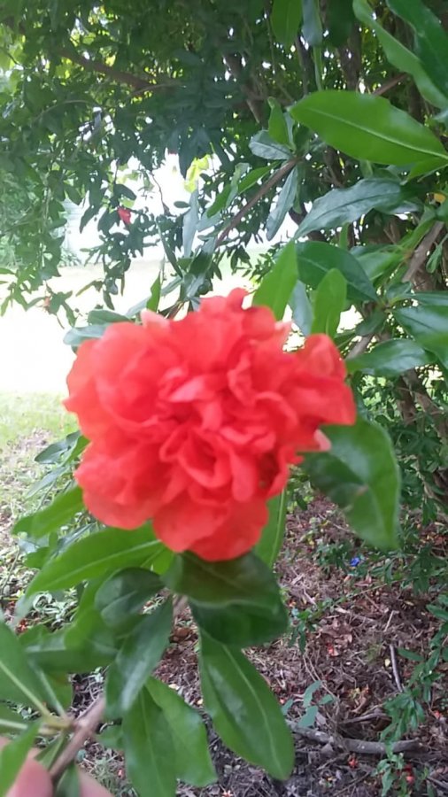 This shrub is in my son’s driveway and produces a seed that looks somewhat like a cherry pit. The blossoms are about two inches (or a little more) across.