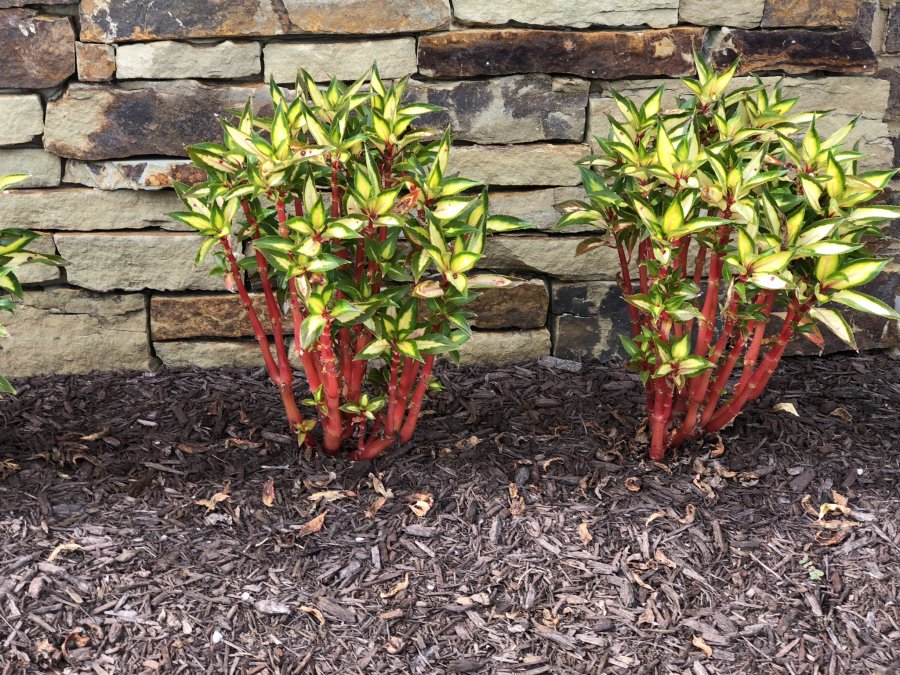 Looks like variegated New Guinea impatiens, I agree with laura735. They should have large flowers covering them. The plants do not look very healthy. They should be a mound shape, covered with larger variegated leaves, buds and flowers. They may have been kept pot bound for too long, before planting in the ground. Perhaps not getting enough light. These are tropical plants that grow well in moist fertile soil with compost or organic matter added. Growing best with part sun, or almost full sun with watering to keep the soil moist and fertilize as needed. Cuttings can be taken, dipped in rooting hormone and rooted in peat moss, vermiculite, coconut coir soil kept moist. Or dig up the plants if you live in an area where it will frost, shake off soil from the roots,trim the top growth tips or down to half the height of the stems. Spray with water to prevent any insects from hitchhiking. Then plant in a suitable size pot using a tropical potting mix. Grown indoors with enough light,the plants will bloom and can be Planted outside again next season. These are mostly treated as seasonal flowering plants replaced each season.